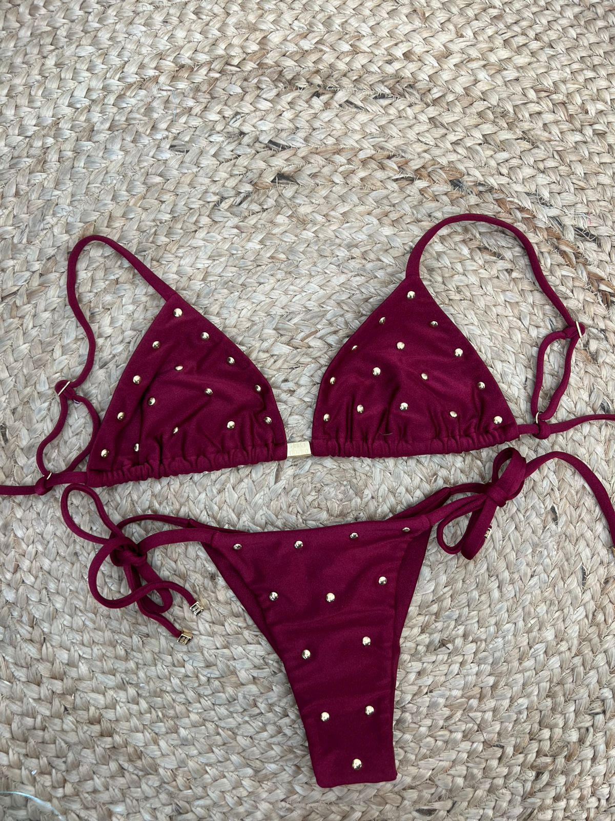 Calcinha com rebites na frente, lacinho, fio duplo.