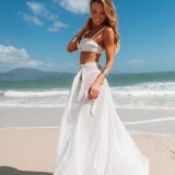 Saia em corte godê, possui cós na cintura para amarrar.