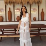SAÍDA FLUÍDA, POSSUI DUAS CAMADAS DE BABADOS, SEM MANGAS, LAçO NA FRENTE.